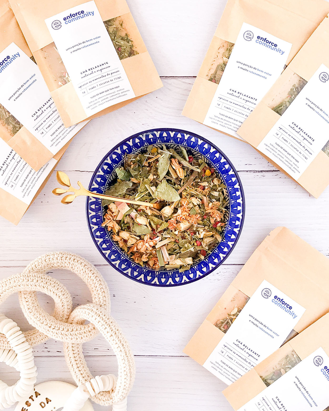Tudo de bom que tem nesse chá, que é puro aconchego: folhas de amora e maracujá, melissa, capim limão, jasmim, camomila, pimenta rosa e fibra de maçã.