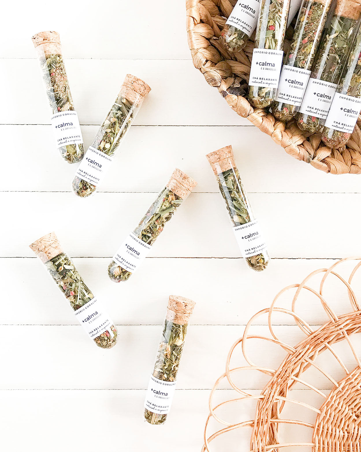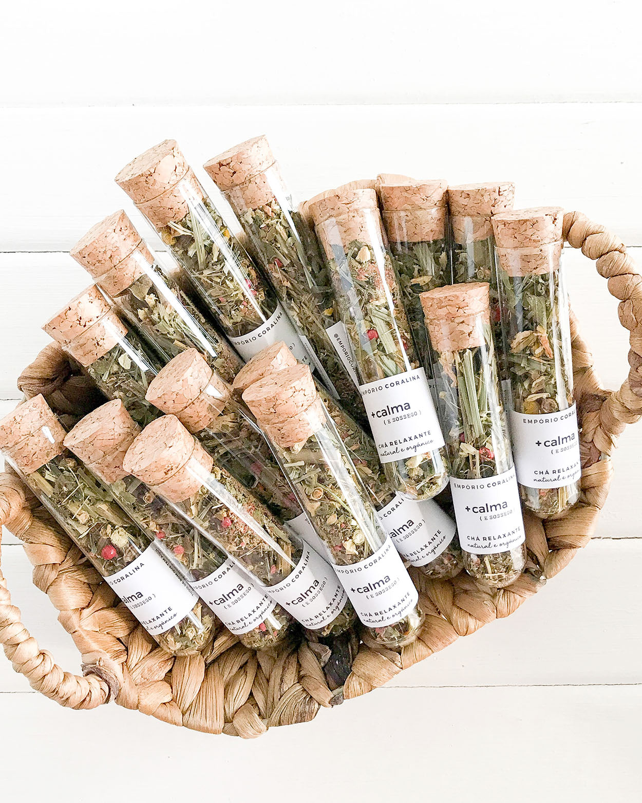 Tudo de bom que tem nesse chá, que é puro aconchego: folhas de amora e maracujá, melissa, capim limão, jasmim, camomila, pimenta rosa e fibra de maçã.