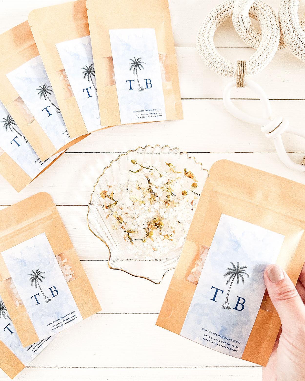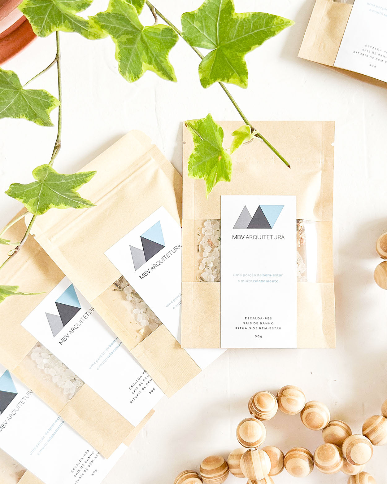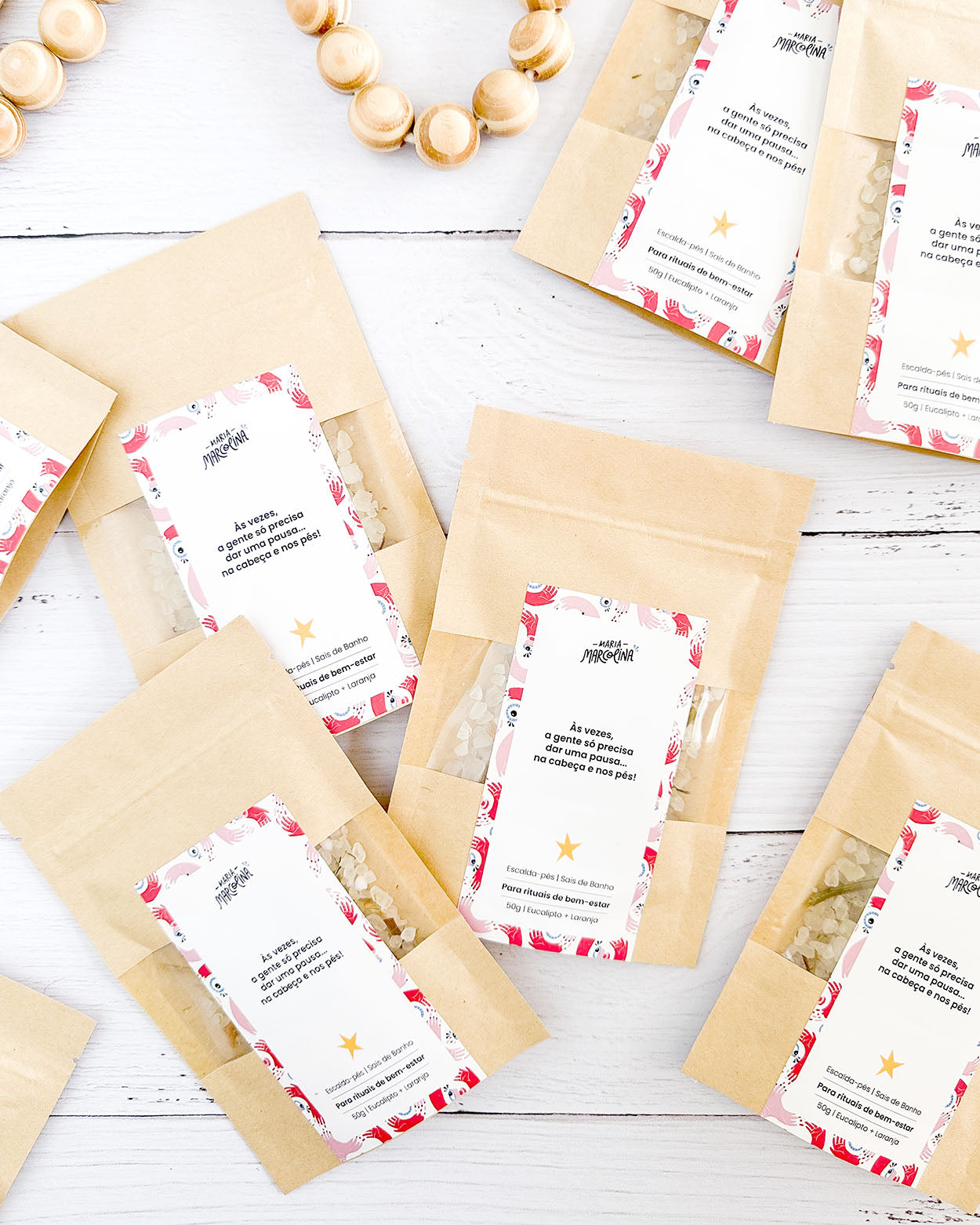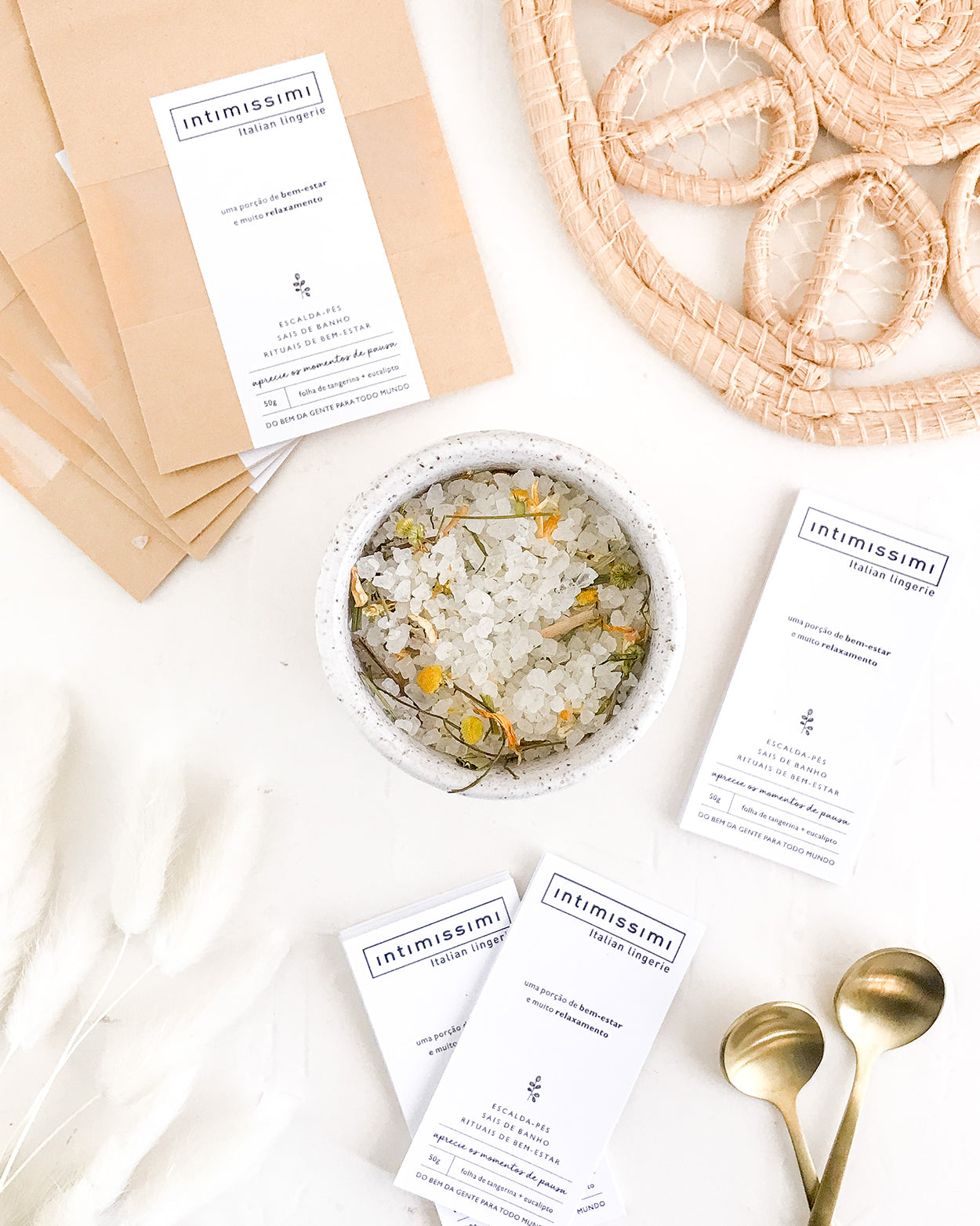 Um sachê kraft com uma porção cheia de boas energias. Um produto 3 em 1: escalda-pés relaxante, sais de banho e rituais de bem-estar.