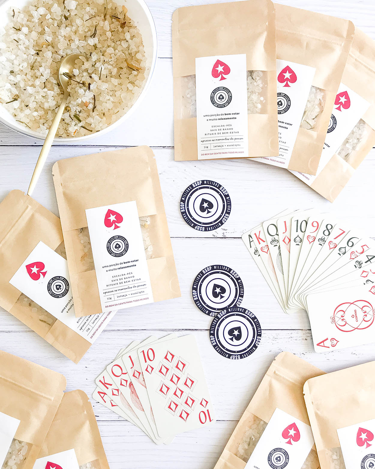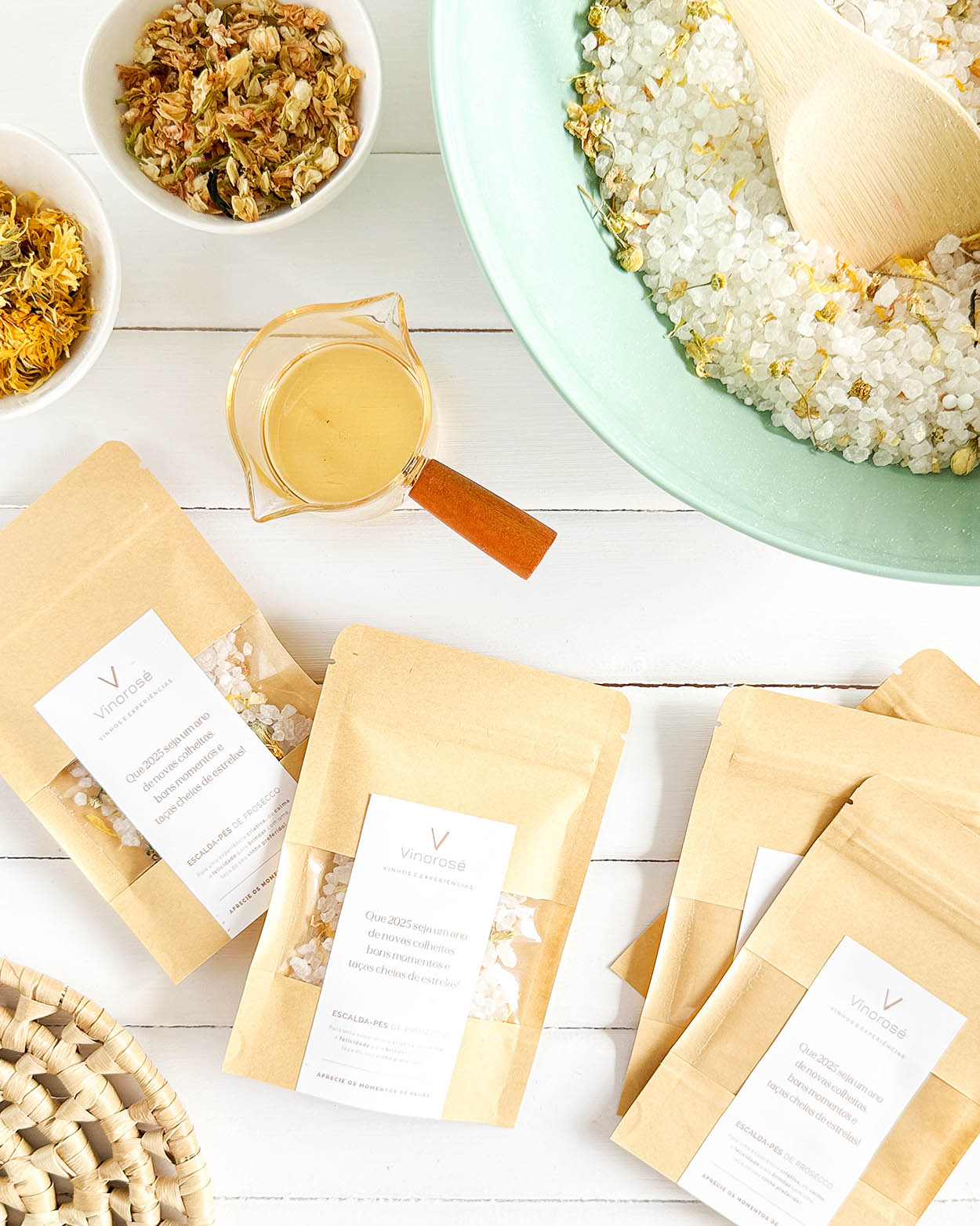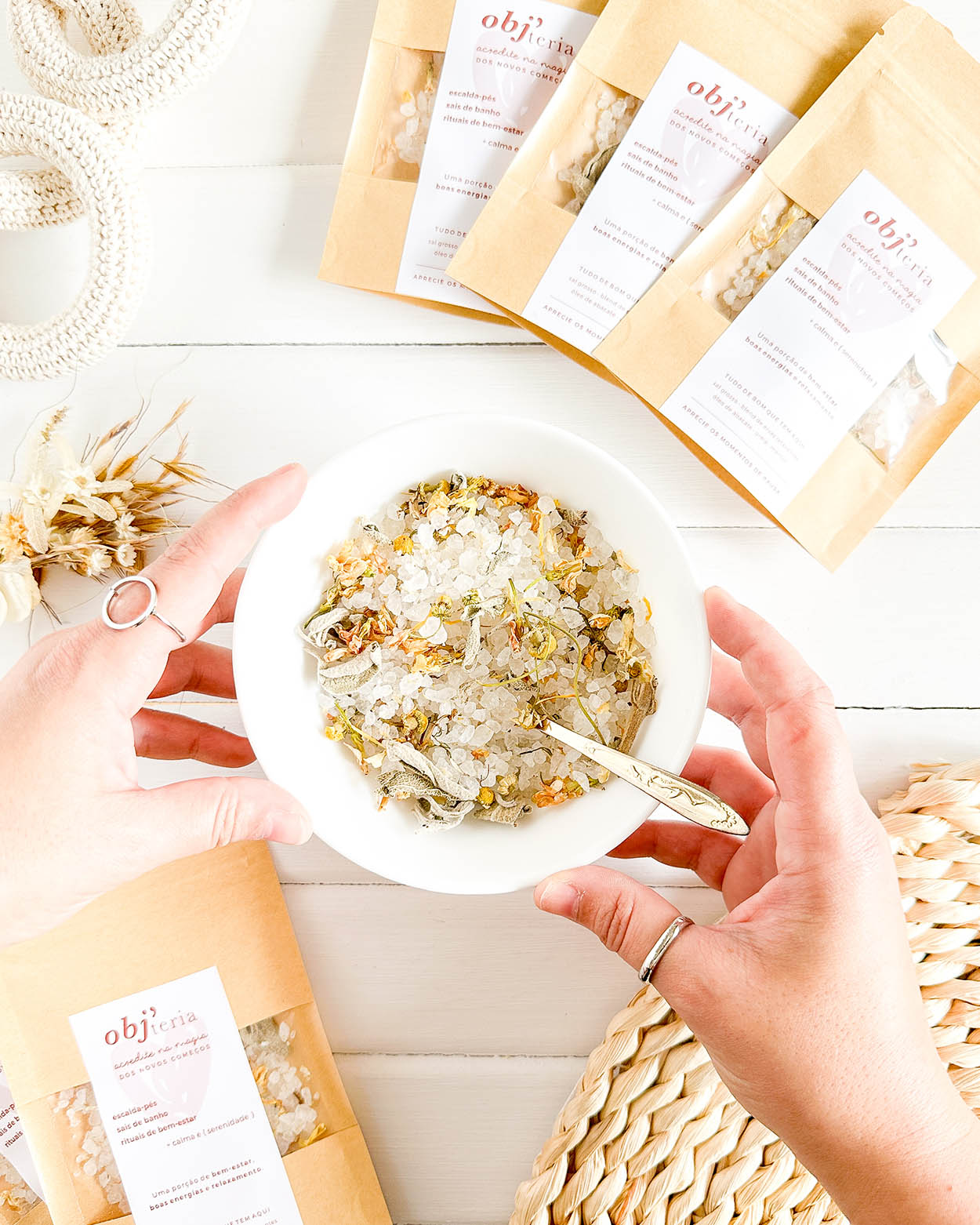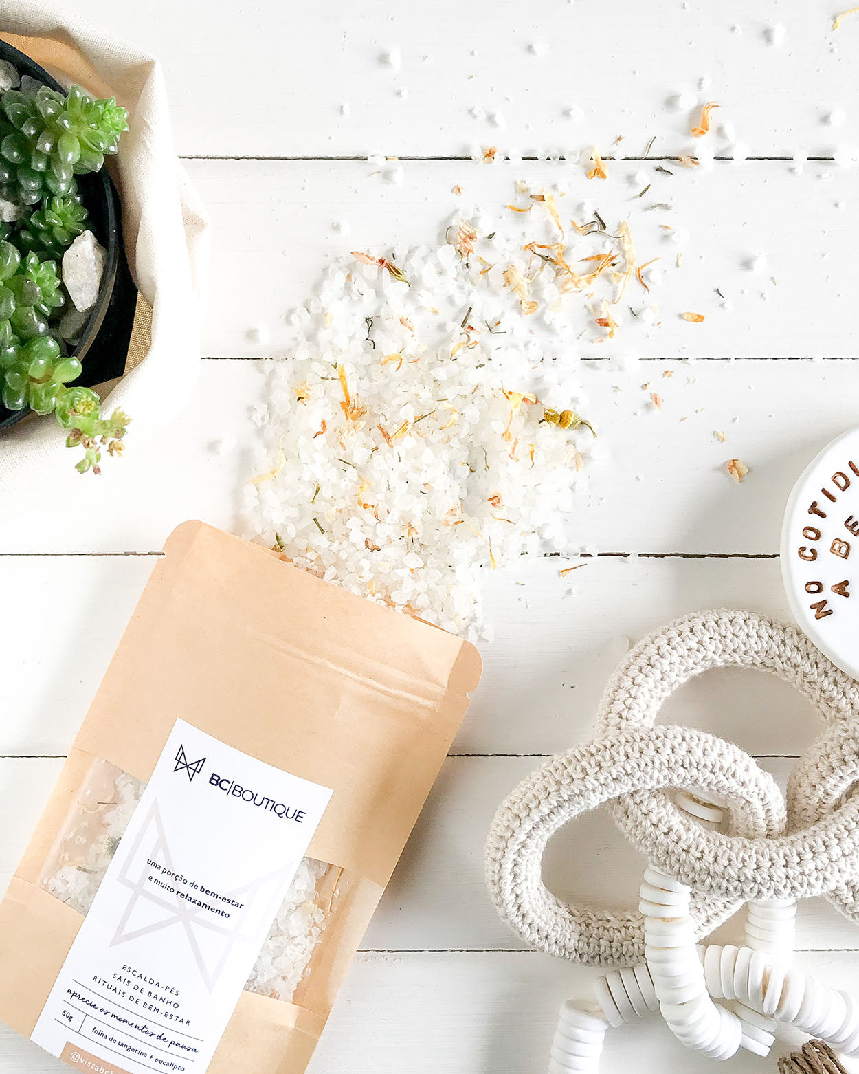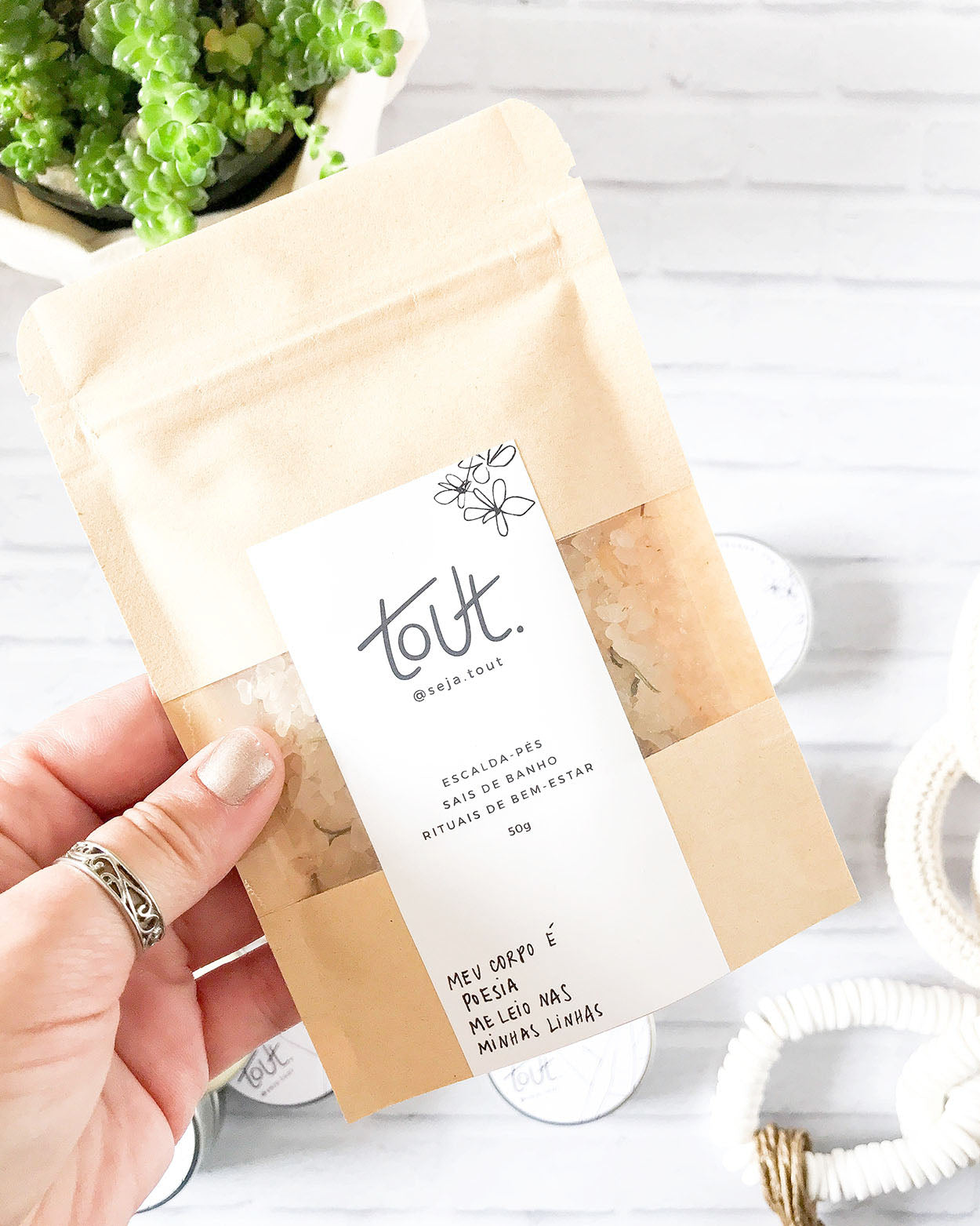Um sachê kraft com uma porção cheia de boas energias. Um produto 3 em 1: escalda-pés relaxante, sais de banho e rituais de bem-estar.