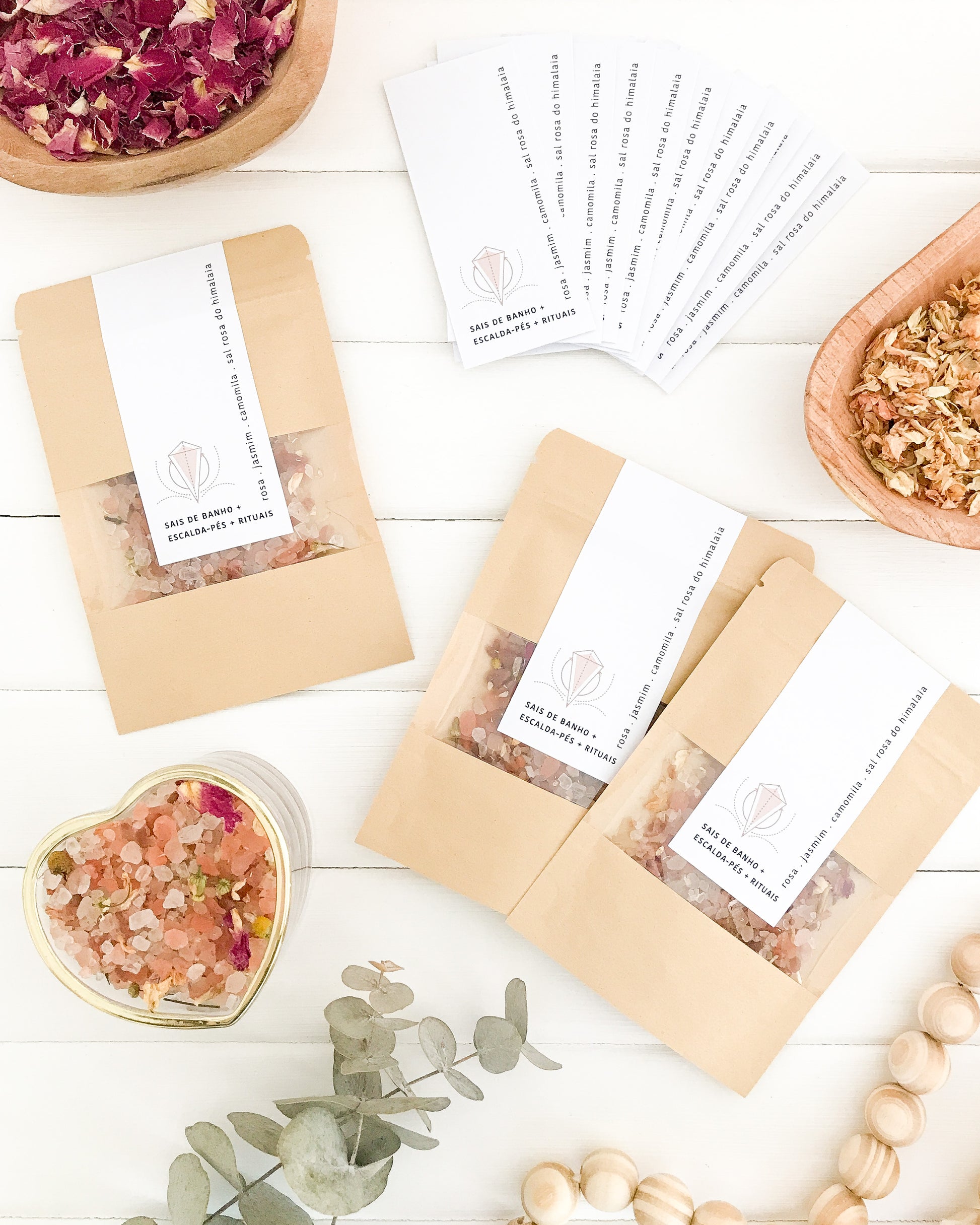 Podem ser utilizados como sais de banho, de banheira, como escalda-pés e nos seus rituais energéticos.