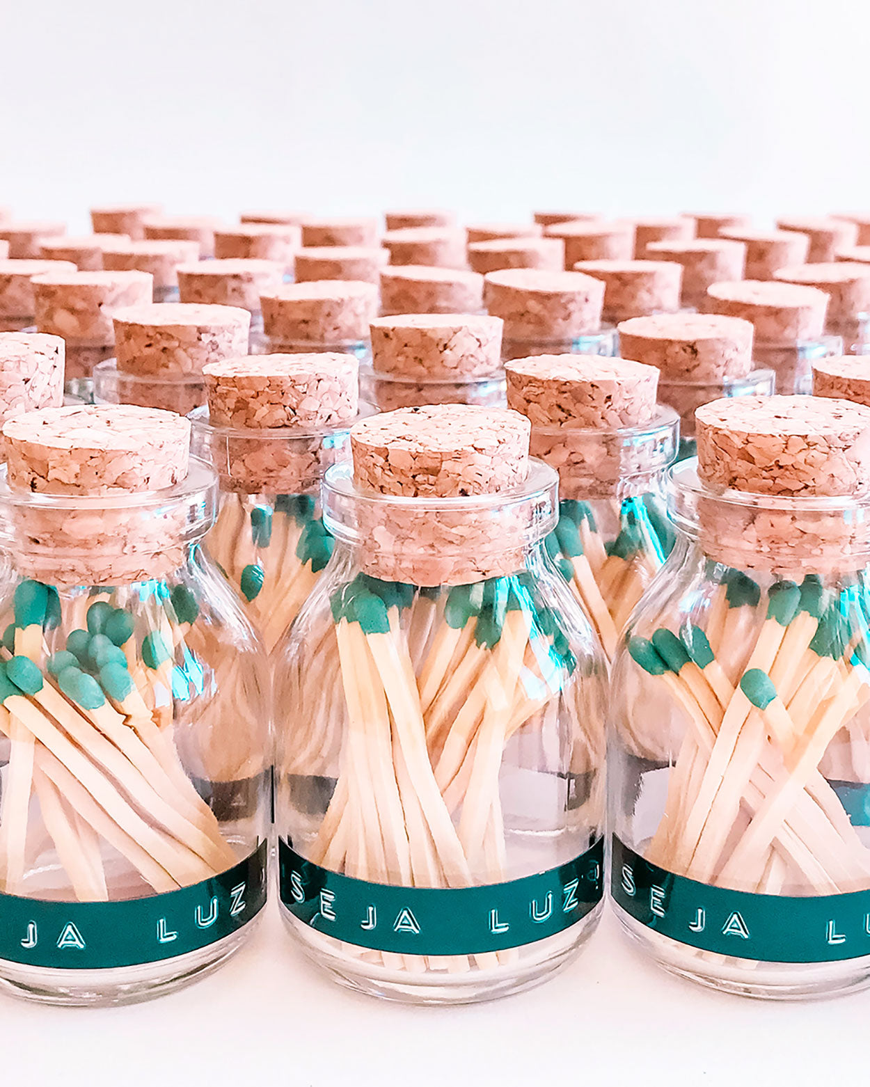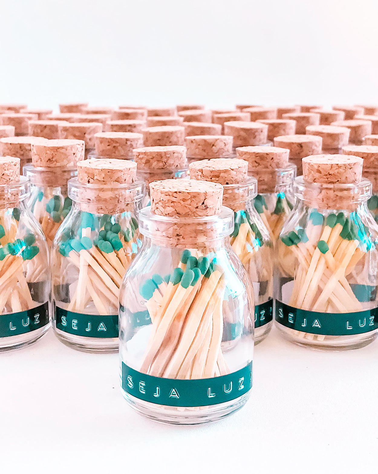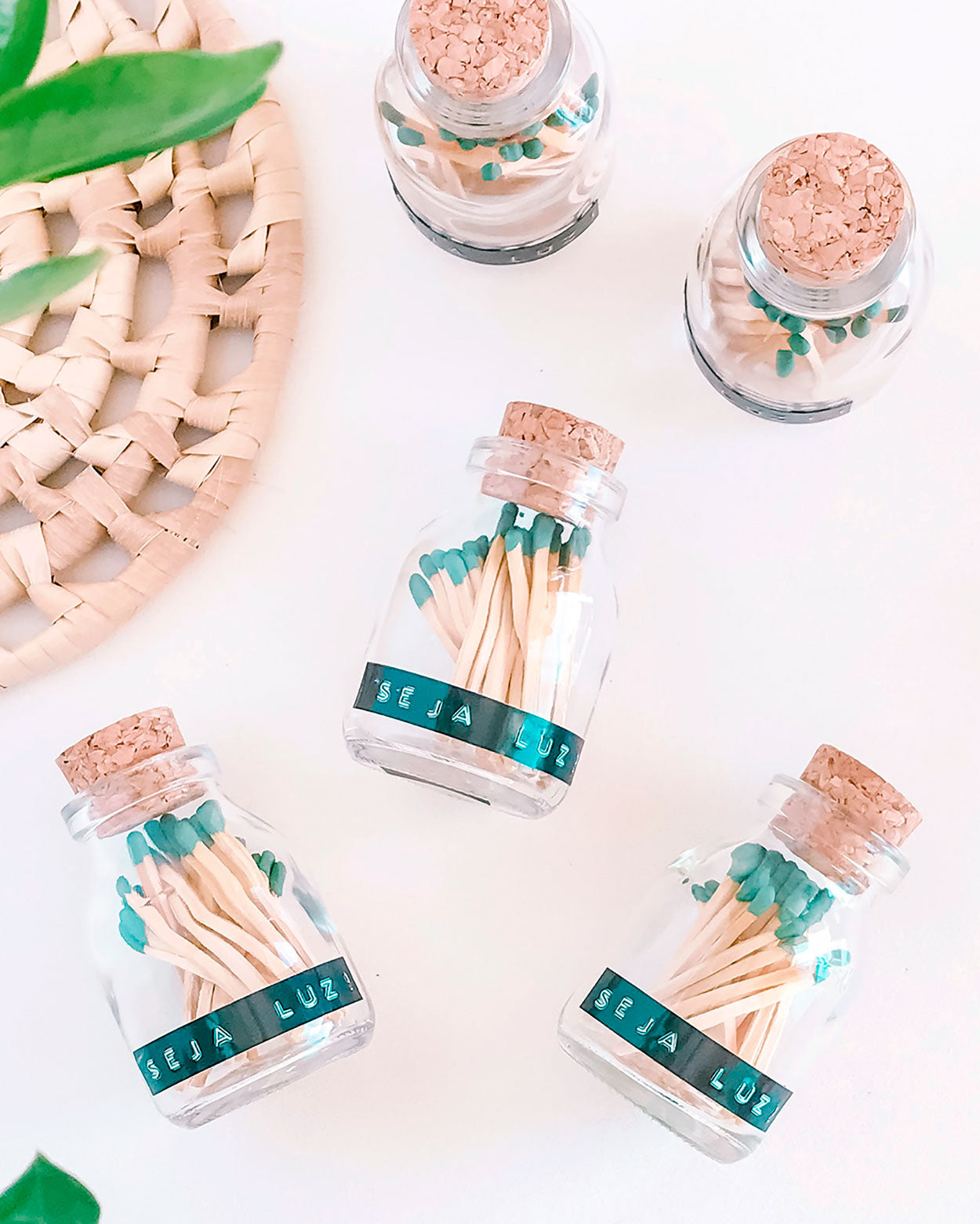 Um potinho de fósforos ecológicos com a mensagem ‘Seja Luz’ feita com etiquetadora vintage.