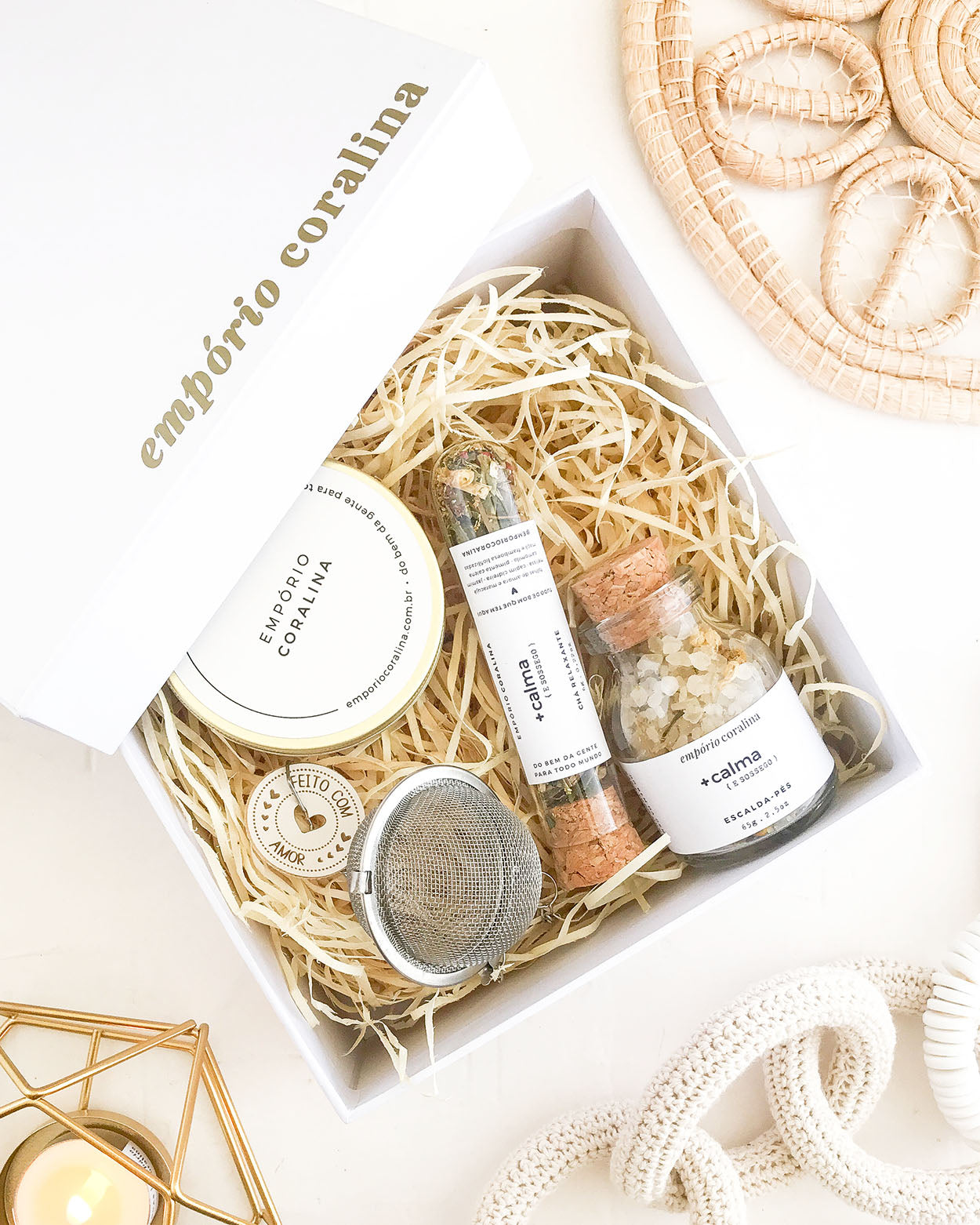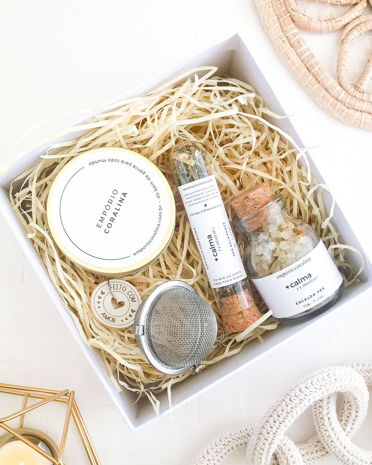 Vem com uma vela aromática para criar uma atmosfera acolhedora e perfumada; um chá de calma e serenidade, cuidadosamente selecionado para inspirar bem-estar; um infusor de chá em metal com etiqueta em couro ecológico; e um escalda-pés, feito com sal grosso e ingredientes naturais, que hidratam e acalmam.