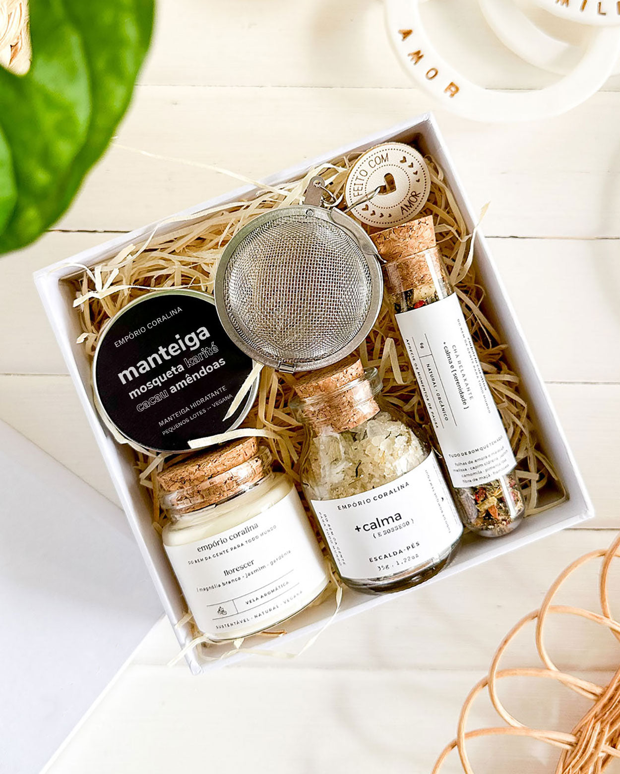 Vem com uma vela aromática para criar uma atmosfera acolhedora e perfumada; um chá de calma e serenidade, cuidadosamente selecionado para inspirar bem-estar; um infusor de chá em metal com etiqueta em couro ecológico; um escalda-pés, feito com sal grosso e ingredientes naturais, que hidratam e acalmam; e uma manteiga hidratante para mãos e pés com manteiga de karité, de cacau, óleo de amêndoas e óleo de rosa mosqueta.